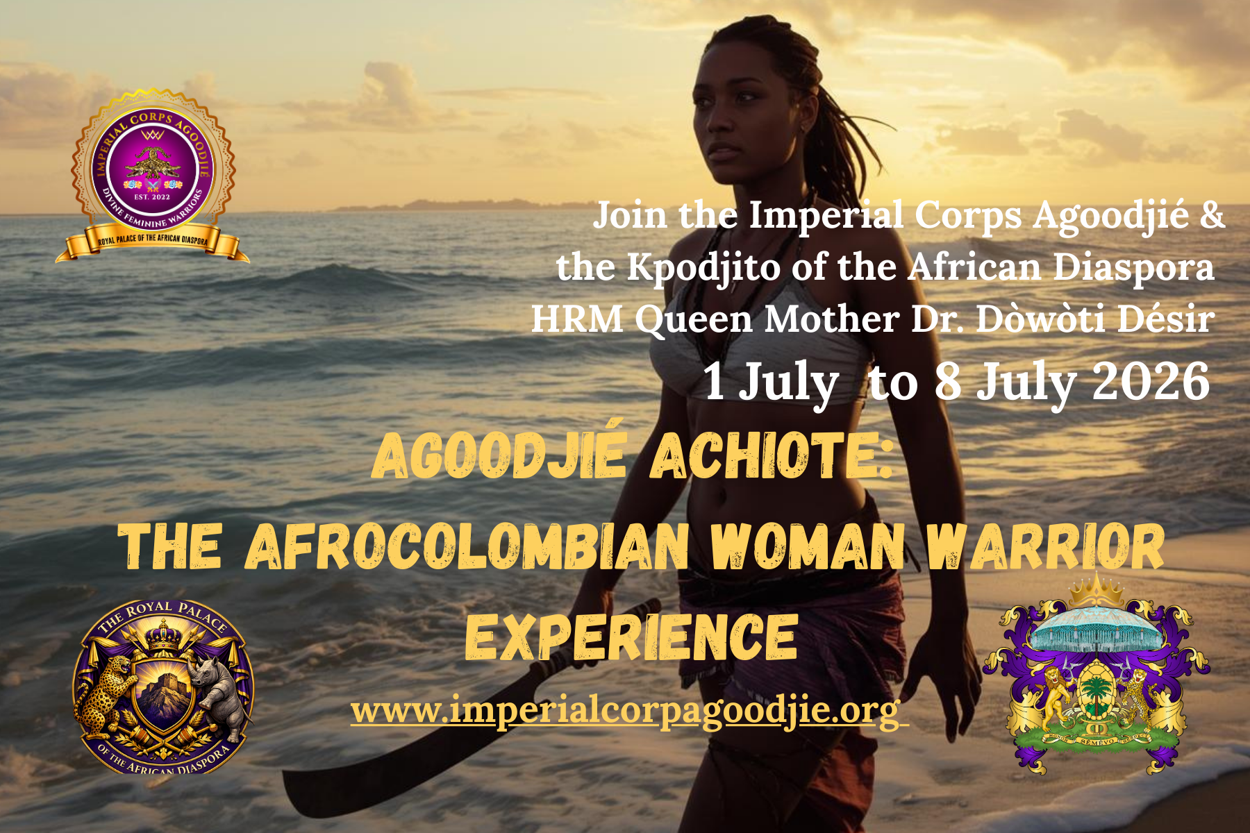 The Divine Feminine warrior woman’s pilgrimage to Colombia transport your to 4 prominent Black Colombian cities: Buenaventura, Cali, Cartagena, and the San Basilico de Palanque from 1 to 8 July 2026. Register here for more information. All cadets are required to attend “The Elements: 5-Sessions On-line Course”. Upon completion, cadets will become certified members of the Imperial Corps Adgoodjié, and be affiliated with The Royal Palace of the African Diaspora. Details to follow in March 2026.